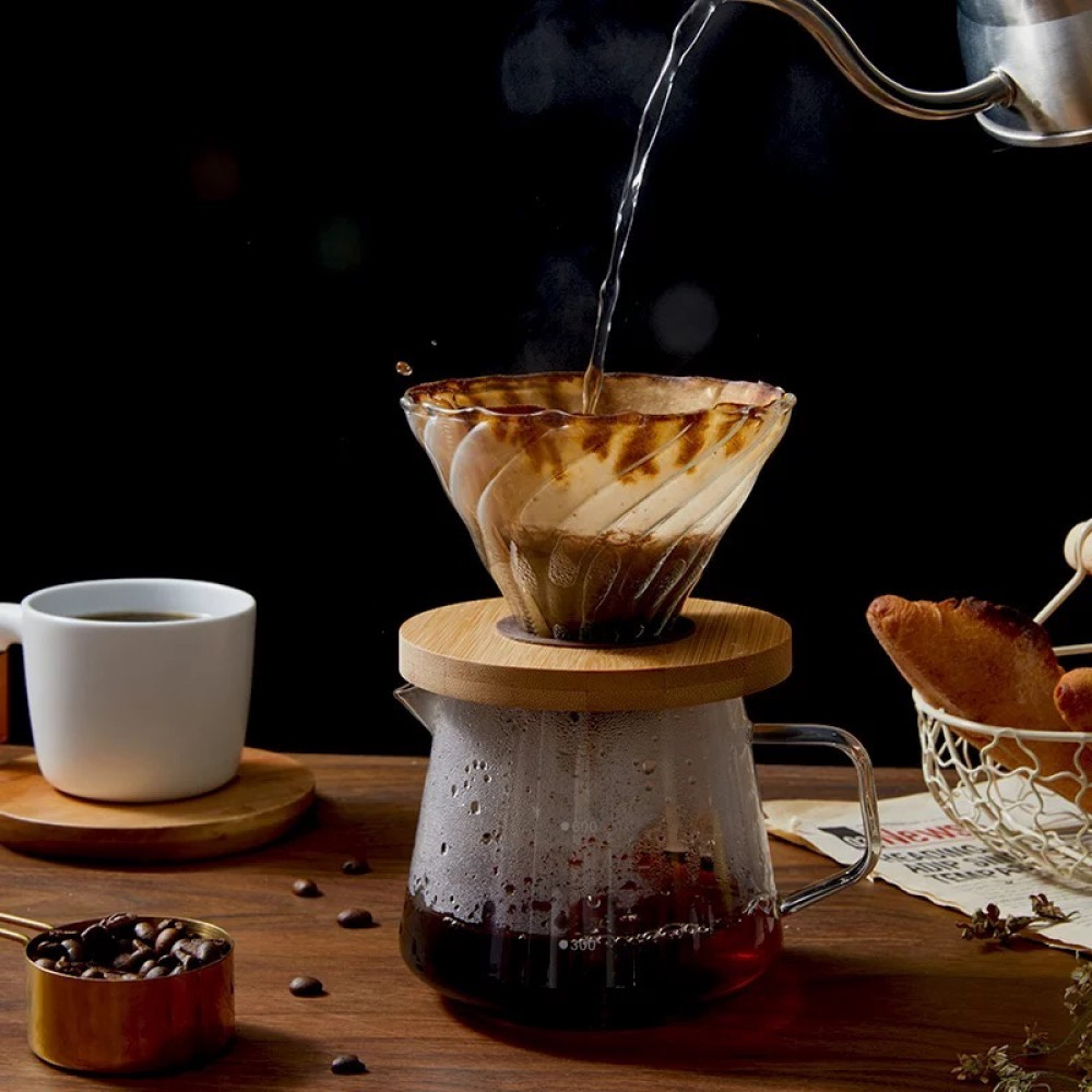 قمع الترشيح على الطريقة اليابانية V60 المصنوع من الزجاج بتمويج حلزوني بفتحة دائريه مع قاعدة خشبية. قمع الترشيح V60 احد أكثر أدوات إعداد القهوة متعة وسهولة في العالم إذ يتميز بطعم قهوة معتدل ومتناسق يجعل تجربة تقطير القهوة ممتع للغاية