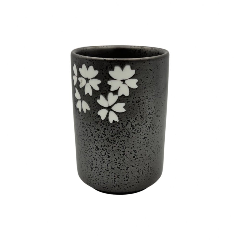 كوب رمادي غامق بزهور بيضاء مصنوع يدويا من السيراميك على النمط الياباني التقليدي بسعة 240 مل